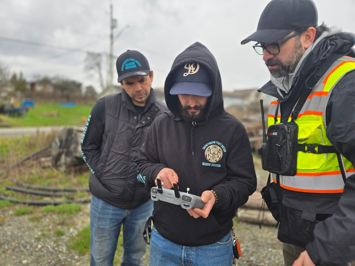 In 2025, the Scw’exmx Tribal Council, Citxw Nlaka’pamux Assembly (CNA), and Raincoast Conservation Foundation launched a pilot project to help salmon adapt to warming waters in the Coldwater River near Merritt. With support from PSF and Dr. Eric Saczuk from BCIT, local crews learned to use thermal drones to map cool-water refuges — naturally cooler patches of water that salmon seek out for relief from heat stress. PSF and Dr. Saczuk have trained 10 Indigenous partners across B.C. to map and monitor salmon habitat using this technology.