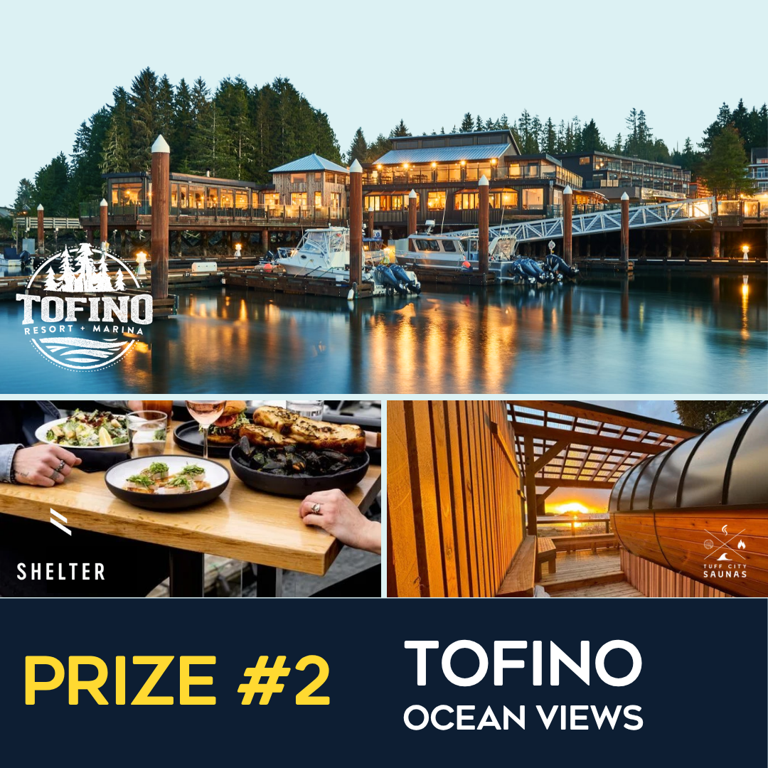 Relax with a 2-night stay at Tofino Resort & Marina, dine in style with a $100 gift card to Shelter Restaurant, and soak in the coastal beauty with a private 2-hour sauna session with Tuff City Saunas. (Value: $1000)