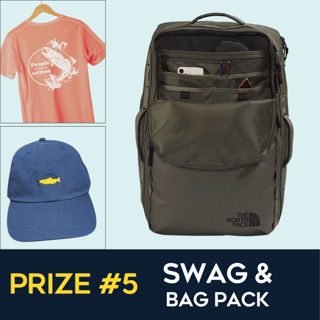 Travel in style with a North Face Voyager pack, plus a People for Salmon tee and PSF dad hat—perfect for any salmon supporter on the go. (Value: $300)