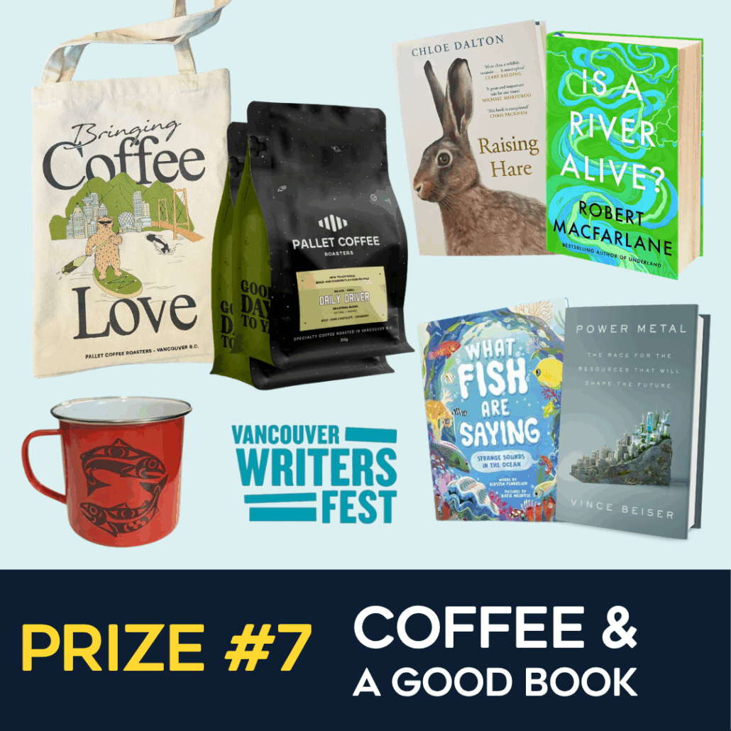Cozy up with two bags of Daily Driver beans from Pallet Coffee and a tote, a Salish Kwakiutl ‘Salmon’ mug, and a set of signed books from the 2025 Vancouver Writers Fest. (Value: $250)