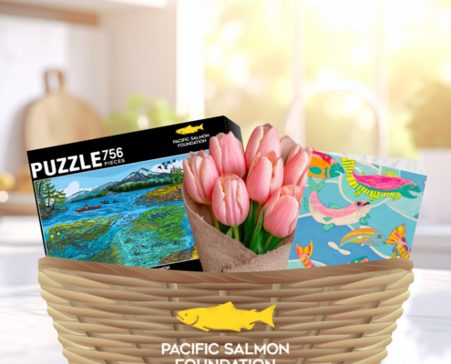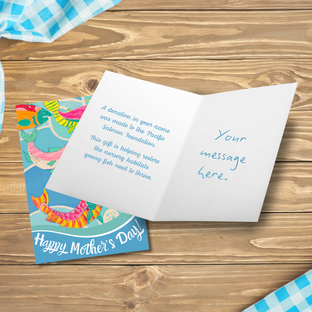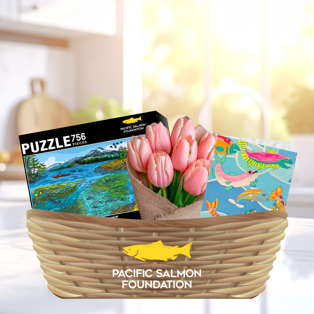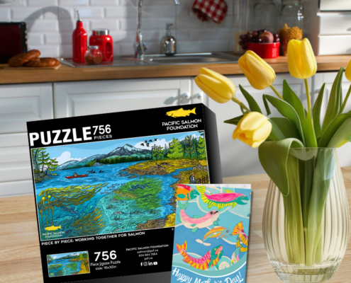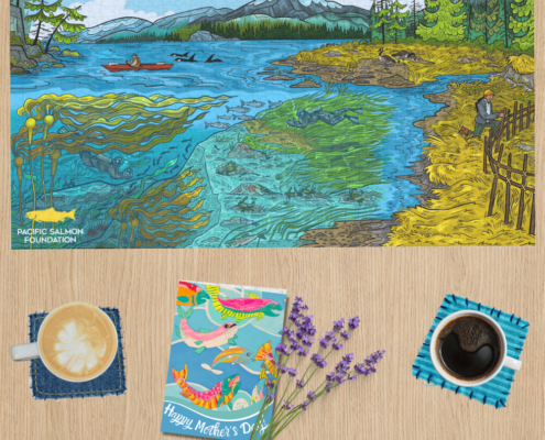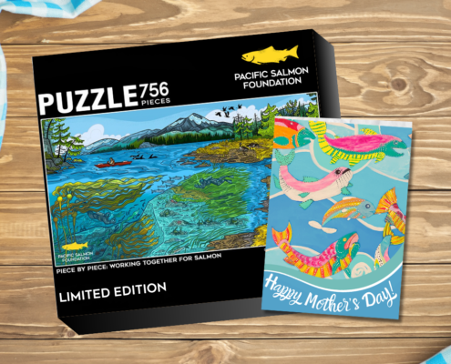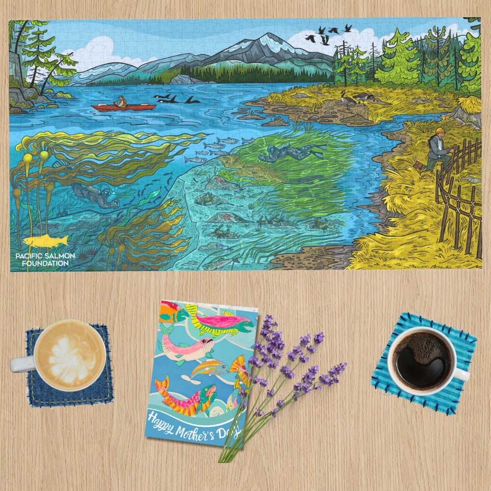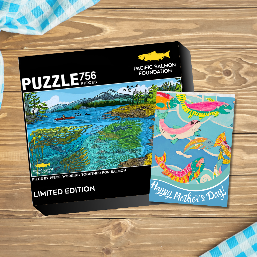 This limited-edition Pacific salmon jigsaw puzzle is a beautiful, nature-inspired keepsake with art by Vancouver-based illustrator Delaney Cox. You can give Mom a puzzle she’ll love, a thoughtful card, and make a real impact for salmon, all for just $50.