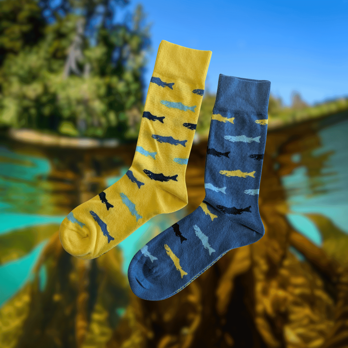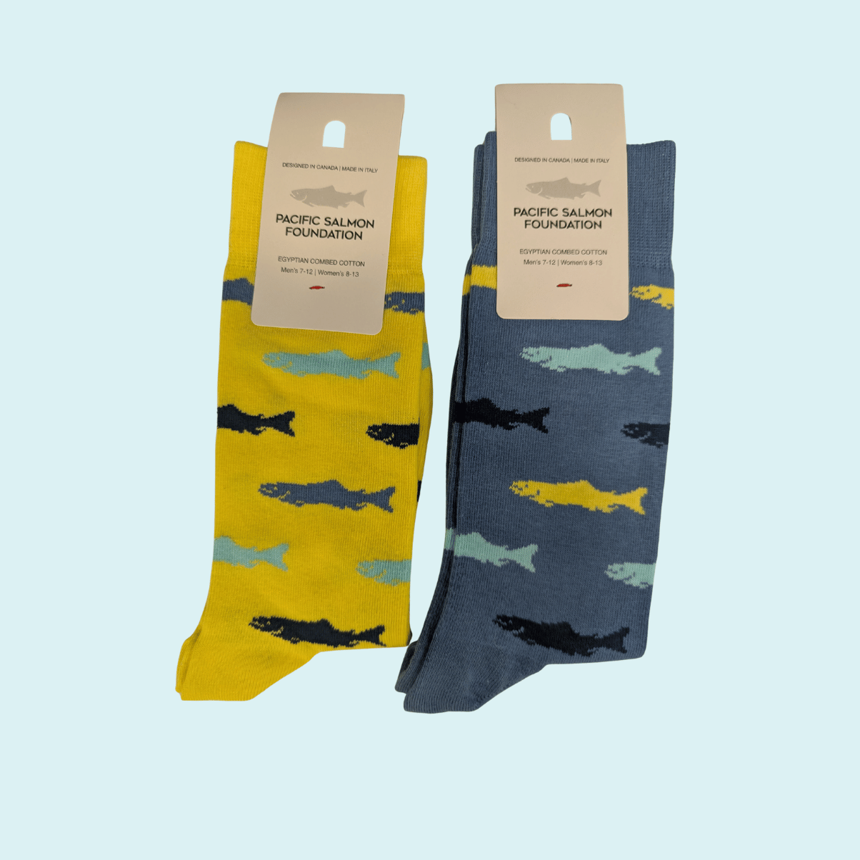 Knock your socks off with our salmon-themed socks! These blue and yellow socks with multi-coloured salmon are designed in Canada and ethically made in Italy from Egyptian combed cotton. One size fits 7-12M.